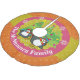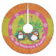 Beautiful Christmas holiday tree skirt features two adorable penguins in ice skates, striped scarves, and winter hats and three decorated Christmas trees on a background of orange and mustard with polka dots, a ring of solid pink with white snowflakes, and a centre of mustard with little white polka dots. You can easily customize this festive holiday tree skirt with your family name!