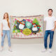 Beautiful Christmas holiday throw blanket features two adorable penguins in ice skates, striped scarves, and winter hats and decorated Christmas trees on a background of white with various colour snowflakes, a solid pink area with white snowflakes, and an aqua blue centre with white polka dots. You can easily personalize with your family name!