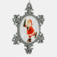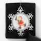 Pewter snowflake ornament with an image of a whimsical Santa on ice skates carrying a star-topped Christmas tree in snowfall. See the entire Christmas ornament collection under the HOME category in the HOLIDAYS section.