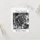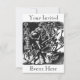 Skeleton Band Invitation: this vintage artwork depicts a groovy skeleton band jamming along with a man in a tux dancing with a pair of empty boots. There are two main giant humanoid skeletons playing skeleton instruments including a violin, a drum, a horn and what might be a piano. The skeletons actually have some of the instruments built into their bones as well as some skeletal musical notes in their hair. They also appear to be dancing along to the music. Its a very interesting artwork that will lend itself to any number of musical events whether it be a classical performance or a jazz band or any number of macabre themed events. the text your invited appears at the top and your event here at the bottom with plenty of space to customize. Inside the invitation " your text here " can be replaced with all the details of your unique event.