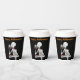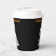 Halloween paper cups with my 3d skeleton character bingeing on Halloween candy. Front and back customizable text says "Happy Halloween!"