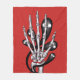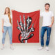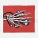 Skeleton hand blanket featuring a graphic illustration of a hand of a skeleton with black spooky ghosts with glowing eyes swirling around it over customizable deep red background.