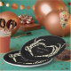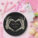 Add a creepy, personalized touch to your wedding with these paper plates. These disposable plates are black and feature an illustration of skeleton hands in a heart shape framing the bride and groom's names and wedding date. The graphic and text are in a cream or ivory colour. The macabre style is perfect for October weddings or events with a goth theme.