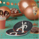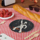 Halloween party paper plates featuring a dancing skeleton in a retro white disco suit, electrified by bolts of lightning and a fun orange dance floor. Perfect for a spooky event, this unique haunted bash design sets the tone for a night of costumes, music, and unforgettable moves.