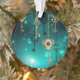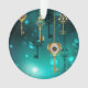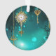 Or, clés antiques avec engrenages et cadrans accrochés sur chaînes dorées sur arrière - plan vert lumineux.