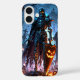 Epic Halloween design of a skeleton knight with pumpkin shield in a glowing graveyard. Perfect gothic spooky artwork.