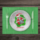 This paper plate has a smiling skeleton holding red and green ornaments with snowflakes up to his eyes wearing a red Santa hat inside a wavy dimensional shape on a white background with circles of various sizes. Customise the Merry Christmas text with the templates.