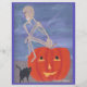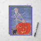 Un tableau amusant d'un penseur squelette, pensant, assis sur un citrouille d'Halloween mignon, est imprimé sur papier plat de 8,5 par 11 pouces. Le citrouille se lève et sa langue sort. Il y a un chat noir debout près du citrouille. Le ciel du soir est dans les tons violet et bleu brumeux. Idéal pour le scrapbooking et d'autres usages arrière - plans. Merci pour faire du shopping à ScrapbookBackgrounds sur Zazzle.