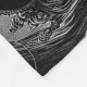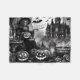 A hauntingly spooky black and white illustration of a skeleton witch with her pumpkins.