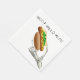 Humourous Halloween party paper napkins, with graphics of a skeleton's hand holding a hotdog. Black text reads Happy Hallo-wienie and can be personalized to read what you want.