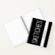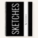 Personalized sketchbook notebook in black and white to use for art and drawing with a large print title of "Sketches by... and your name" printed on the cover in a modern sans serif font.