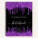 Black background. Purple faux glitter drips, paint dripping look. The title: sketchbook written with a girly modern hand lettered style script with swashes. White coloured letters. A notebook for drawings, sketching, notes and school homework.