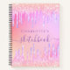 A trendy iridescent coloured background with unicorn and rainbow pastel colours in pink, purple, rose gold. Decorated with faux glitter drips in rose gold, pink. Personalize and add a name. The title: Sketchbook is written with a trendy hand lettered script with swashes. To keep the swashes only delete the sample name, leave the spaces or emoji's in front and after the name.