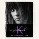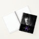 A chic black background. Personalize and add your own photo, a name, monogram letter and a year. The name is written in white with a large modern hand lettered style script with swashes. The monogram letter in purple. For school, work as a sketchbook, diary and journalling. To keep the swashes only delete the sample name, leave the spaces or emoji's in front and after the name