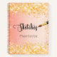 An orange and rose gold gradient background. Decorated with faux gold glitter sparkles. Personalize and add a name, The title: sketchbook written with a girly modern hand lettered style script with swashes and a brush. Black coloured letters. A notebook for drawings, sketching, notes and school homework.