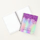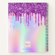A trendy holographic coloured background with unicorn and rainbow pastel colours in pink, purple, rose gold, mint green. Decorated with faux glitter drips in rose gold, pink and purple. Personalize and add a name, The title: sketchbook written with a girly modern hand lettered style script with swashes. Purple coloured letters. A notebook for drawings, sketching, notes and school homework.