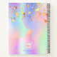 A trendy iridescent coloured background with unicorn and rainbow pastel colours in pink, purple, mint green. Decorated with dripping stars and a rainbow coloured unicorn. Personalize and add a name. The title: Sketchbook is written with a trendy hand lettered script with swashes. To keep the swashes only delete the sample name, leave the spaces or emoji's in front and after the name.