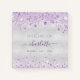 A faux silver metallic looking background with violet, purple faux glitter dust. Add your name, and text. The name is written with a hand lettered style script with swashes.