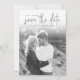 A modern and stylish save the date design featuring a grey text overlay and a full bleed vertical or portrait oriented photo. "Save the Date" appears at the top in hand sketched script typography, with your names, wedding date, and location tucked into the design. Add additional details, like your wedding website, to the reverse side.