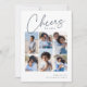 Share cheer with these modern New Year holiday cards featuring 6 of your favourite photos in a grid collage layout. "Cheers to [Year]" appears at the top in classic serif and casual hand sketched cursive script. Personalize with your family name at the lower right.