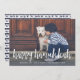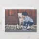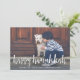 Share holiday greetings with these Hanukkah photo cards featuring your favourite horizontal or landscape oriented photo in striking full bleed. "Happy Hanukkah" appears at the bottom as a text overlay in white brush lettered typography. Personalize with your family name or names beneath, and a custom greeting if desired. Cards reverse to a watercolor dot and leaves pattern in navy blue and white.