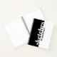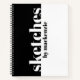 Personalized sketchbook notebook in black and white to use for art and drawing with a large print title of "Sketches by... and your name" printed on the cover in a trendy modern blocky bold serif font.