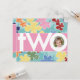 Highlight your beautiful two-year-old in the "O" for "two" on this invitation. Colourful, roughly sketched flowers make an adorable background. Add your child's photograph and customize the information on the back to make your child's second birthday an unforgettable one! Available in other colour options with matching postage and favours. Some art courtesy of KeepDesigning.