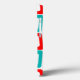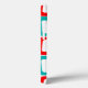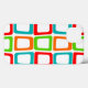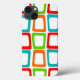 This phone case has a mid-century modern design of repeating skewed rectangles in red, orange, green, and turquoise.