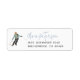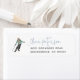 La conception d'une station de ski d'hiver comprend une illustration de l'aquarelle d'un skieur en tenue d'hiver, ainsi que votre adresse de retour en lettres bleues et grises.