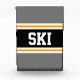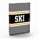 This sporty, athletic design features bold SKI text inside a highlighted wide black stripe with double white and yellow racing stripes against grey outer stripes. The text can be personalized.