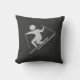 A skiing action figure similar to public safety signs. The background texture is a dark grey burlap. The text is distressed so that it appears to be painted onto the burlap. You can personalize this design.