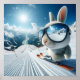 A cute bunny equipped with skis and wearing oversized sunglasses is zooming down a snowy mountain slope. The sun shines brightly, reflecting off the snow and the glasses, creating a whimsical and playful scene.