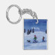 A watercolor painting of cross-country skiers adorns this customizable keychain!