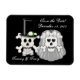 Skull and crossbones wedding couple with bride and groom names, wedding date and "Save the Date!" text. Bride skull wearing veil and white bow; groom wearing top hat and bow tie. Customizable text templates allow you to input your own information.