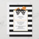 The elements of this modern Halloween wedding bridal shower invitation are a fun black skull couple with an orange bow and hat paired with an elegant black and white pattern border. Your text is in a white frame with gold outline.