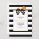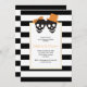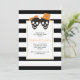 The elements of this modern Halloween wedding rehearsal dinner invitation are a fun black skull couple wearing an orange bow and hat paired with an elegant black and white pattern border. Your text is in a white frame with gold outline.