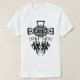 Tribal Tattoo style cross with twin flaming skulls with fangs is a unique design for all light coloured apparel.