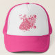 A pink coloured image of woman dressed in a lace gown and mask dancing lightly in a cloud of skulls.