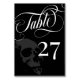 Elegant dark Halloween or goth wedding table number card with a swirly white calligraphy script and the faint image of a skull.