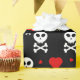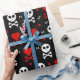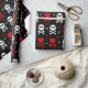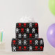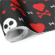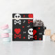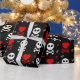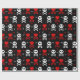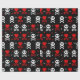 Seamless pattern of a white with red skull and a black background with hearts and crossbones.