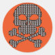 Cute Halloween sticker features a skull made from lots of tiny skulls. Orange background. Halloween stickers make great trick or treat gifts, and are fun for decorating all your Halloween projects.