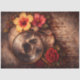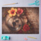 The composition combines floral elements with a skull focal point, blending gothic and botanical themes. Deep red, brown, and muted tones create a strong contrast against the aged, textured backdrop.