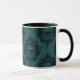 Introducing our hauntingly stylish Halloween mug, where eerie meets elegance in a mesmerizing display of artistry. This mug features a striking black and green pattern adorned with skulls, all intricately framed within an elaborate scroll frame. The design is set upon a background of alternating light and dark green stripes, adding depth and intrigue to the overall aesthetic.