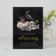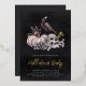 A spooky chic Halloween party invitation featuring a skull, bones, gothic flowers and a raven sitting atop a white pumpkin, on a smoky black background. Personalize this unique and elegant Halloween party invitation with your event details beneath, with gold foil accents.