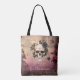 Embrace the eerie elegance of Halloween with this captivating themed tote bag. The elaborate background features a mesmerizing combination of red roses, ornate iron scrollwork, and pink and beige old paper with mysterious writings. Against this haunting backdrop, a creepy yet beautiful decorated skull takes centre stage, adorned with striking blue and golden roses.