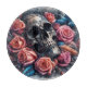 Intricate artwork featuring a beautifully detailed skull adorned with roses, feathers, and a vibrant bluebird, symbolizing the contrast between life, death, beauty, and transformation in an elegant artistic arrangement.