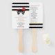 Skulls and black, white stripes red wedding program hand fan. It displays a skull couple. The bride wears a red bow and the groom a red hat. On the upper part there is a striped black and white border.