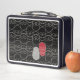This is a standard metal lunchbox that appears to work just fine. We designed this box ourselves with an uploaded photo and custom text on the front and back. It looks absolutely beautiful except the front of the lunchbox is not centered like it shows in the photo. The print borders don't align with the inset flat part of the box where the preview photo online showed it perfectly centered in there. The back looks nice and centered though.