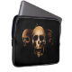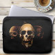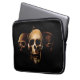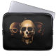 Three human skulls against a backdrop of black. A little creature is peeking over the middle skull