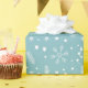 This sweet wrapping paper features a sky blue pale background with a pattern of white snowflakes, white polka dots, stars and dainty botanicals. Matching stickers are also available.